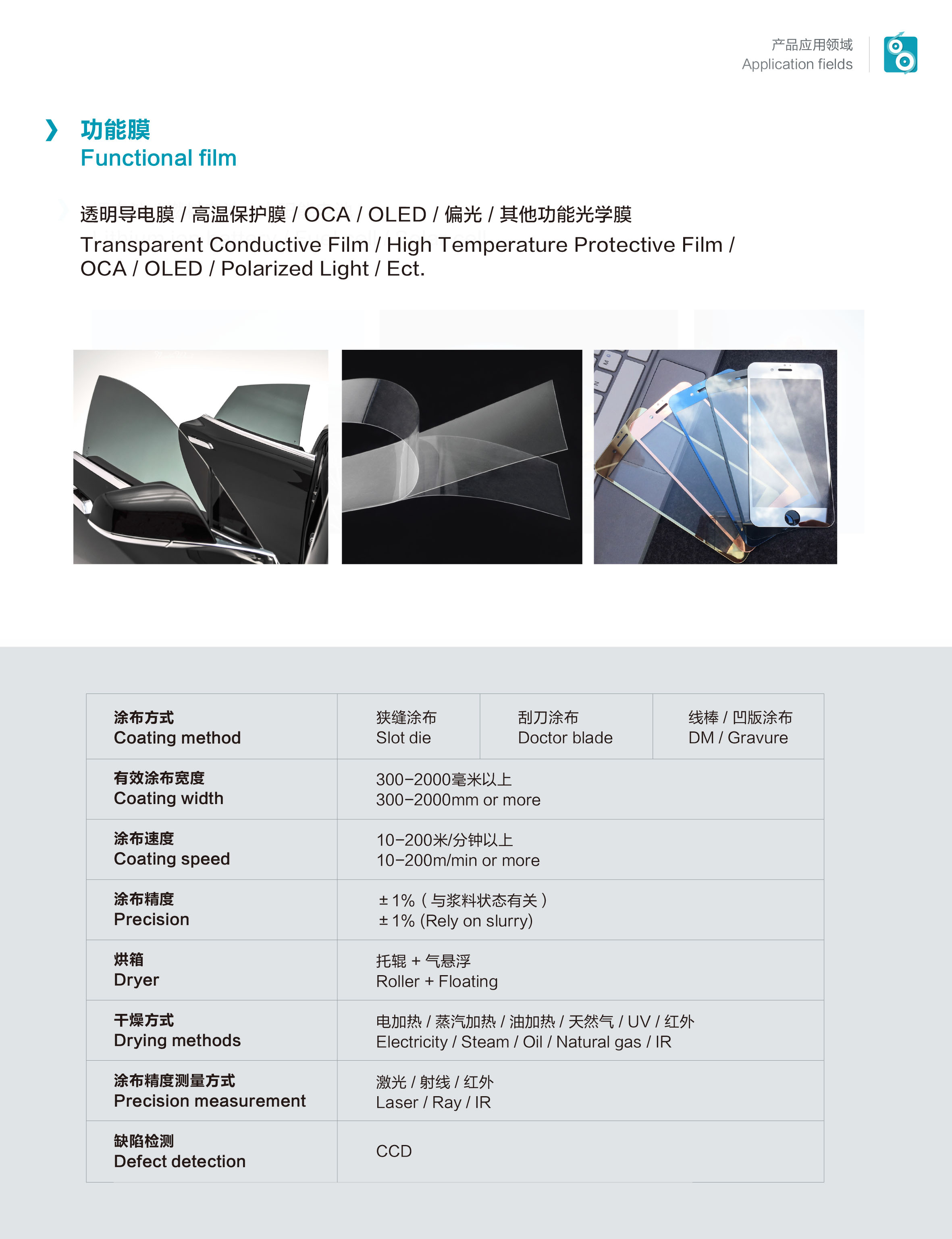 Mainly used for: hard coating film, anti-reflection (AR), low reflection (LR) film, various release films, lithium battery separators, various primer layer films.